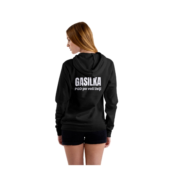 Kakovosten pulover s kapuco z možnostjo personaliziranega potiska za gasilska društva. Na hrbtni strani je izpostavljen napis “GASILKA” ter možnost dodatnega napisa “PGD po vaši želji”, kar omogoča prilagoditev posameznemu prostovoljnemu gasilskemu društvu.